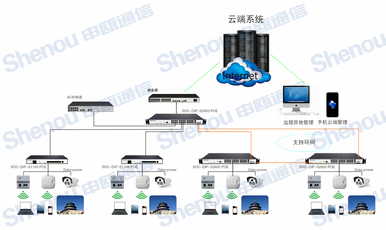 PoE交換機(jī)是以太網(wǎng)供電交換機(jī),在不改變原有網(wǎng)絡(luò)架構(gòu)的基礎(chǔ)上通過現(xiàn)有的以太網(wǎng)雙絞線纜提供網(wǎng)絡(luò)終端設(shè)備所需要的直流電源。通常為無線AP、網(wǎng)絡(luò)攝像頭、網(wǎng)絡(luò)電話機(jī)、掌上電腦等PoE終端設(shè)備供電。申甌PoE交換機(jī)采用研發(fā)技術(shù),具有完備網(wǎng)絡(luò)功能外,提供了超長距離的數(shù)據(jù)傳輸與供電能力,距離可達(dá)100米,不僅節(jié)省了電力線,而且可以使無線AP與網(wǎng)絡(luò)監(jiān)控設(shè)備工程的安裝更為靈活。 其核心芯片采用PoE供電芯片,穩(wěn)定可靠,端口未連接時,自動進(jìn)入待機(jī)模式節(jié)省能源,綠色環(huán)保,端口防雷設(shè)計,增加了產(chǎn)品的抗浪涌性能。尤其適合應(yīng)用于百萬高清監(jiān)控系統(tǒng)、無線AP景區(qū),不僅能提高工程形象,而且大幅度節(jié)約安裝成本。